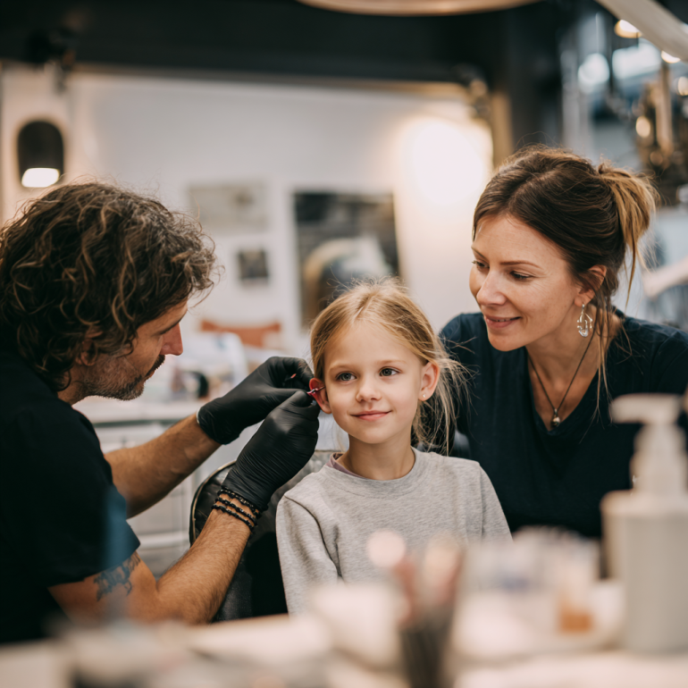We offer children’s earlobe piercings from age 6 and above, provided a parent or legal guardian is present throughout the appointment. The parent or guardian must provide written consent and remain in the studio for the duration of the piercing. For children under 6, we do not perform ear piercings, as we believe waiting until a child is old enough to understand basic aftercare helps ensure a smoother healing process.