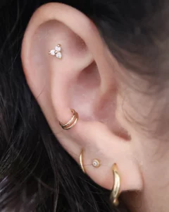 The helix piercing is placed along the upper outer rim of the ear cartilage. It’s one of the most popular ear piercings due to its versatility — you can wear small studs for a subtle look or opt for hoops, cuffs, and chains for something more eye-catching. Healing usually takes 6–9 months, and it’s a great choice for building a curated ear.