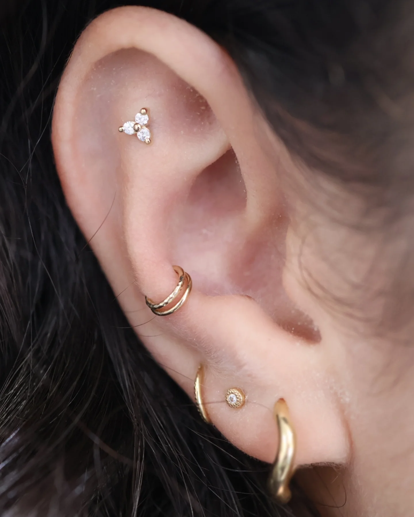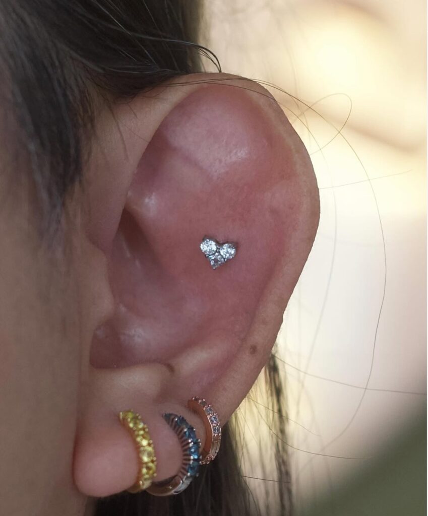 The daith ear piercing passes through the small fold of cartilage just above the ear canal, making it one of the most distinctive and eye-catching placements. It’s usually styled with a hoop or a captive bead ring that highlights its curved shape. Healing time is usually around 6 to 9 months, and while some people also associate it with migraine relief, there isn’t strong scientific evidence to support this. Still, its unique look makes it a favorite for those wanting something different.