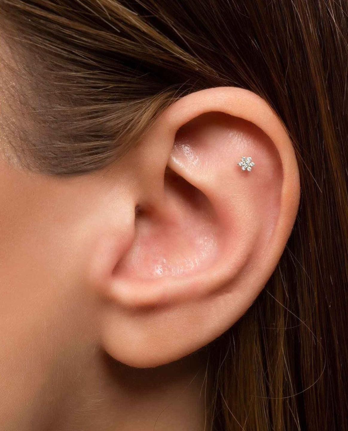 A flat ear piercing is placed on the flat cartilage area of the upper ear, between the outer rim and the inner folds. It’s a versatile spot for stylish studs and decorative jewellery.
