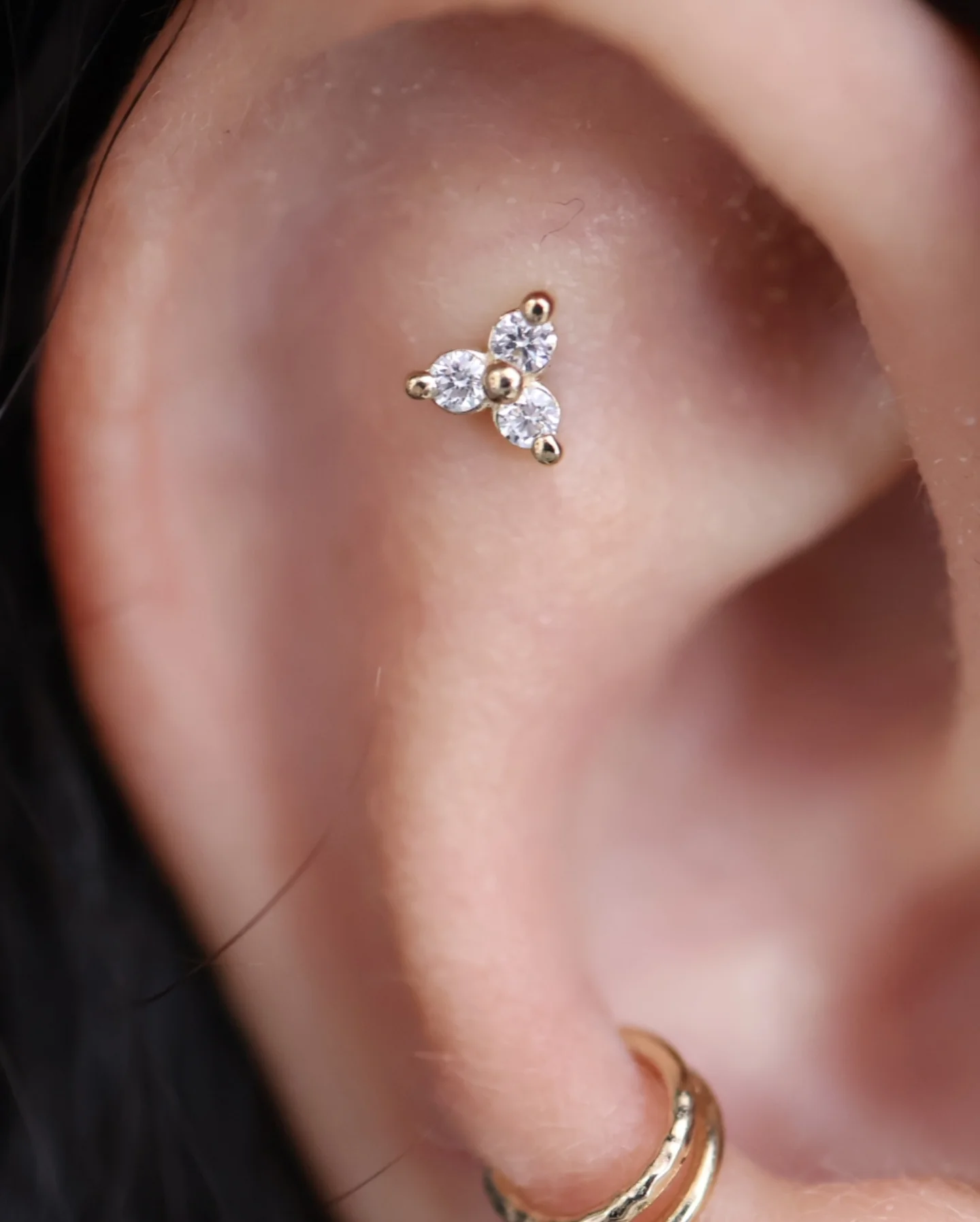 The tragus piercing is located on the small, thick piece of cartilage right in front of the ear canal. It’s a discreet yet stylish option that works well with tiny studs or small hoops. Healing generally takes 3–6 months, and due to its placement, it can slightly muffle sound when healing if swelling occurs, but this is temporary.