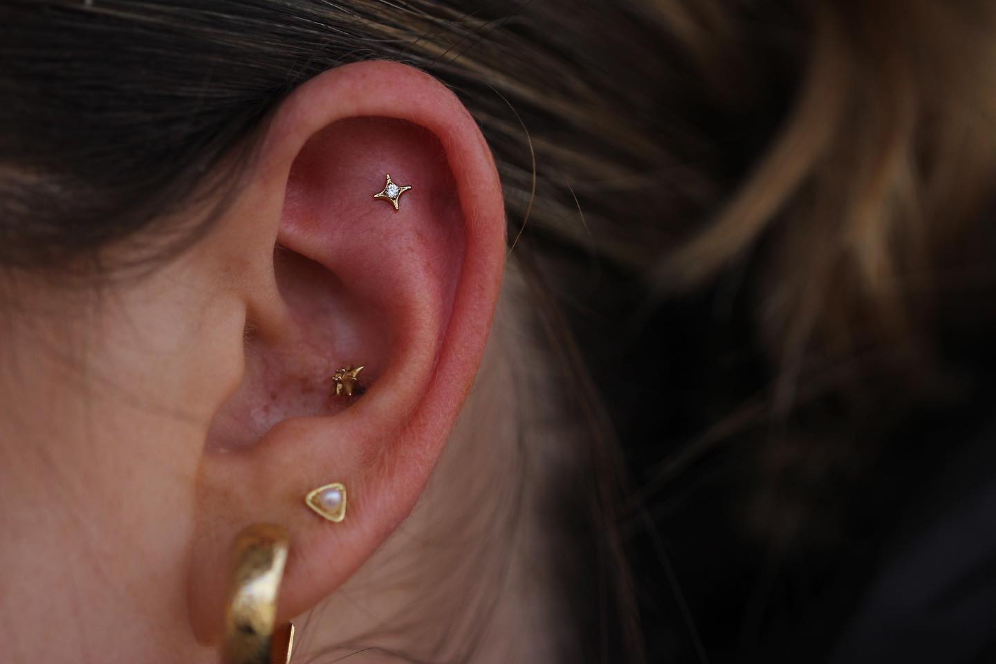 The helix piercing is placed along the upper outer rim of the ear cartilage. It’s one of the most popular ear piercings due to its versatility — you can wear small studs for a subtle look or opt for hoops, cuffs, and chains for something more eye-catching. Healing usually takes 6–9 months, and it’s a great choice for building a curated ear.