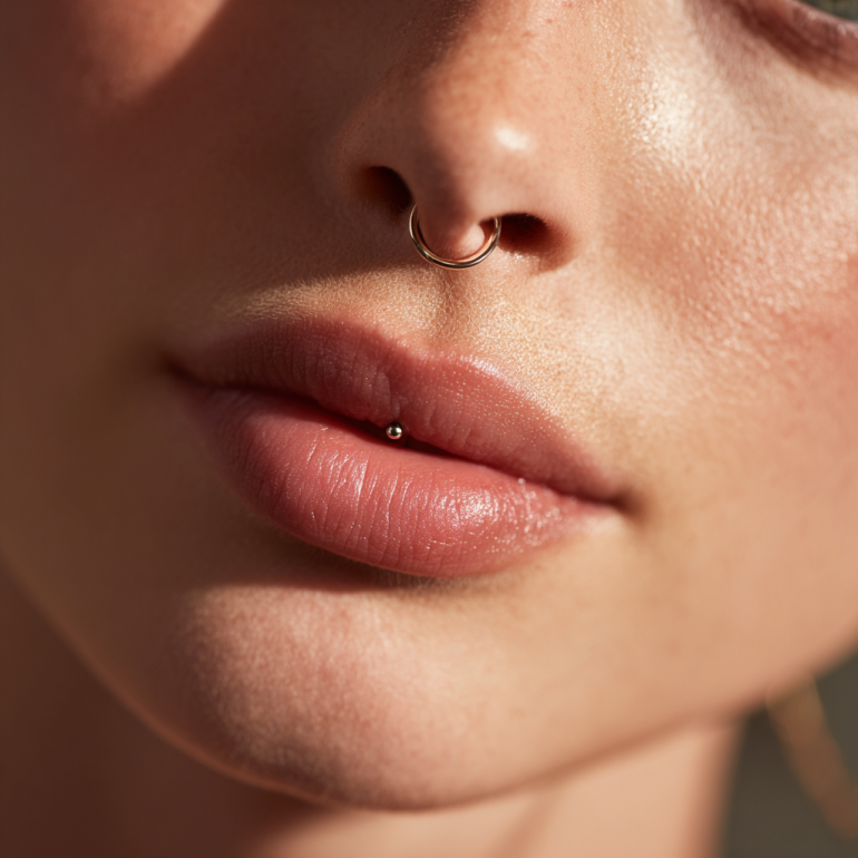 A Labret Lip Piercing sits centrally below the lower lip, creating a stylish and versatile accent. It’s a popular choice for those seeking a subtle yet expressive facial piercing.